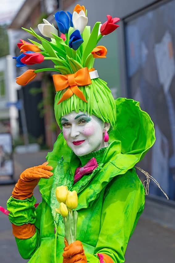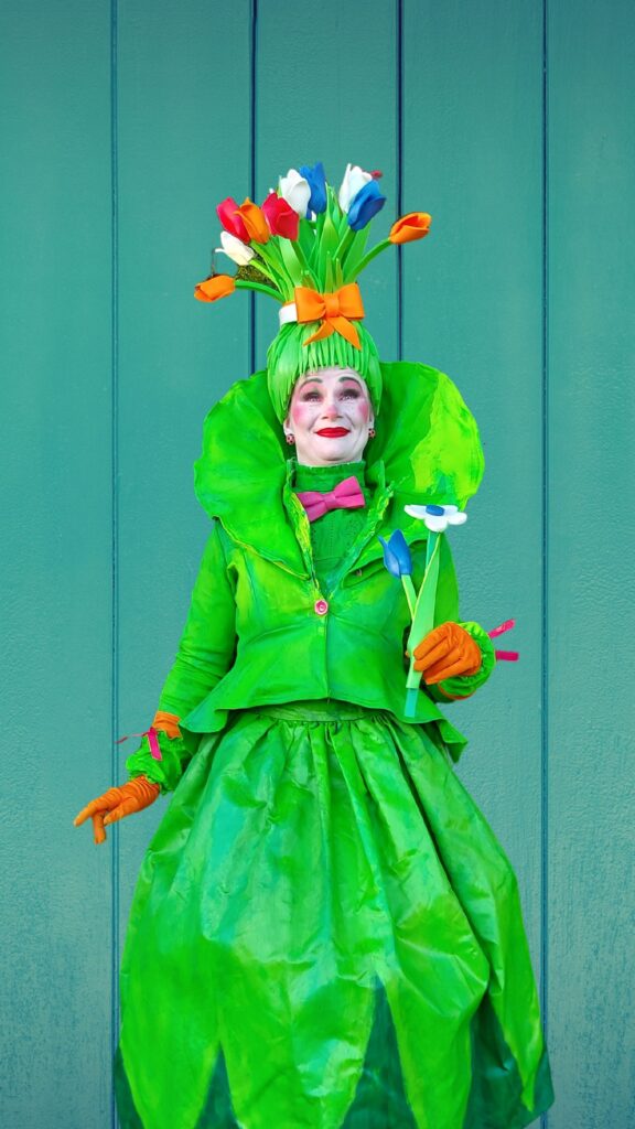 A wonderfully comic and exaggerated character, Miss Tulip delights audiences of all ages. Through playful walkabout interaction, she shares whimsical stories about scents, flowers, and life’s little dilemmas. As a living statue or walkabout – character performer, she expresses her most important questions — the tragedy of missing tulips, or the eternal struggle of deciding whether yellow or pink flowers are nicer — all through expressive mime and physical comedy.