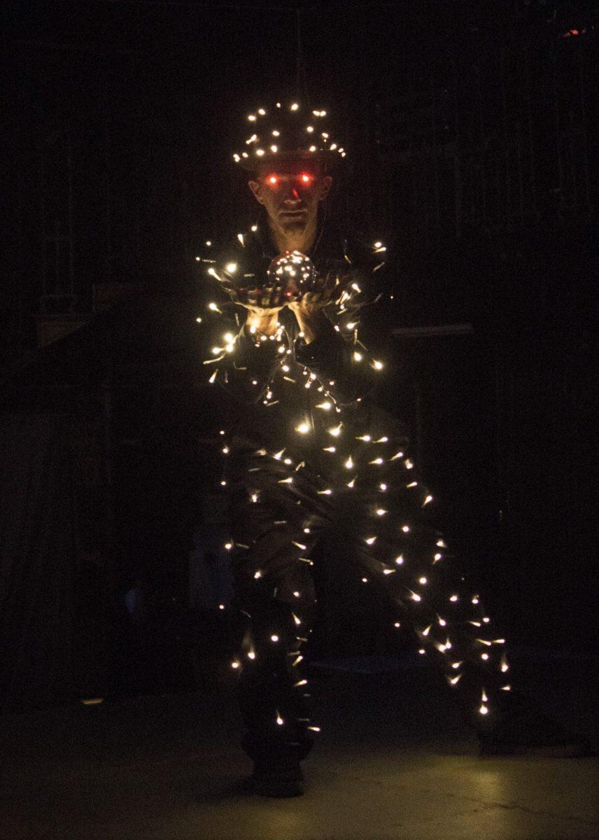 This is a walkabout or stage character who performs with glow poi or crystal contact ball at night. He is covered in a galaxy of stars, which reflect beautifully in crystals and the poi orbit like colourful comets.
